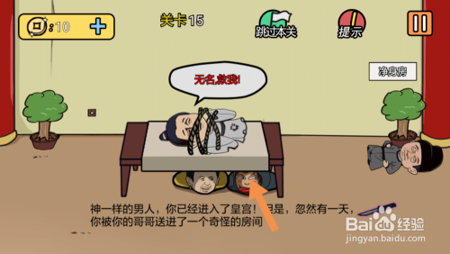 第15关点击桌布,然后点击下图中箭头标注的人,最后将小刀拖动到绳索处就过关了。