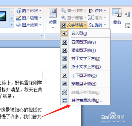 点击“文字环抱”的下拉菜单,选择其他结构选项;