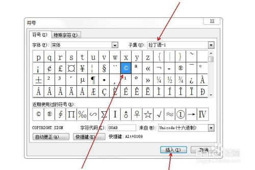 在“子集”中选择“拉丁语-1”,并鄙人方选中版权符号,点击“插入”。
