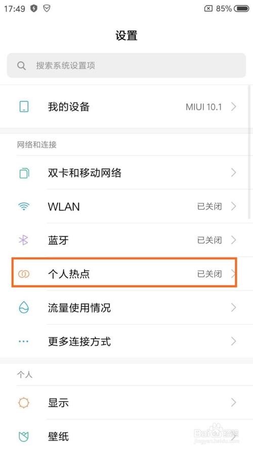 进入设置后,找到“小我热点”这个选项,点击一下。