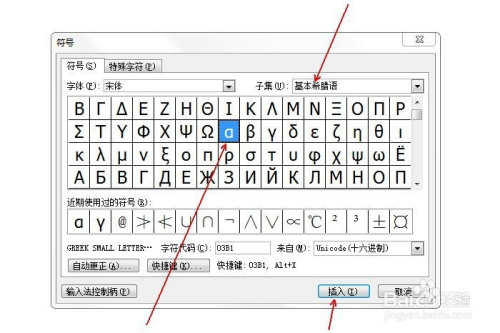 在“子集”中选择“根基希腊语”,并鄙人方选中希腊字母阿尔法α,点击“插入”。