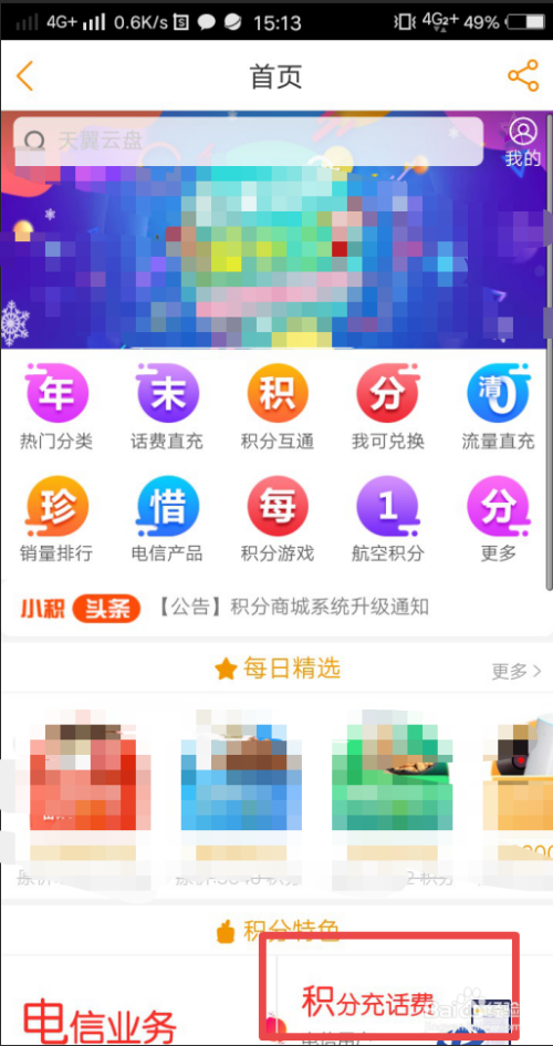 进入【积分兑换】页面,点击右下方的【积分充话费】。