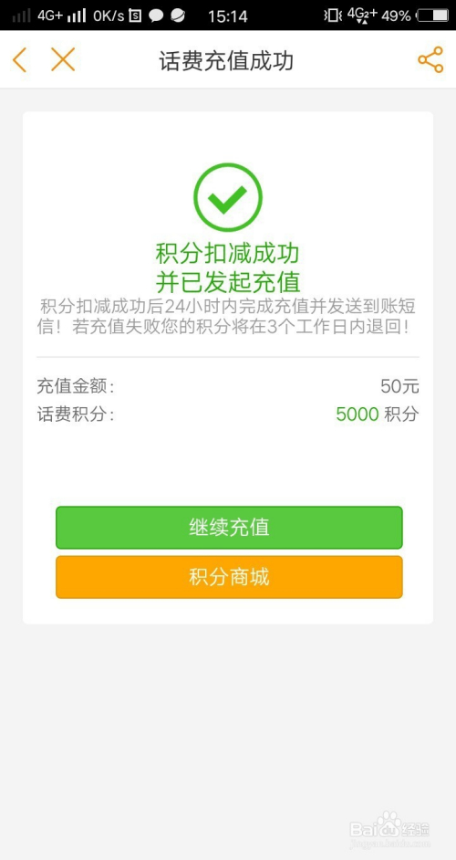 提醒【积分扣减当作功,并已倡议充值】,积分扣减当作功24小时内完当作充值并发送到账短信,充值掉败就会退回积分。