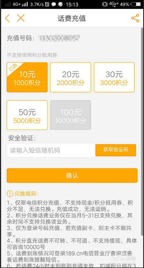 进入【话费充值】页面,1000积分可以换10元话费,选择你要换话费的数额,点击【获取验证码】,收到验证码后输入验证码,点击【确认】。