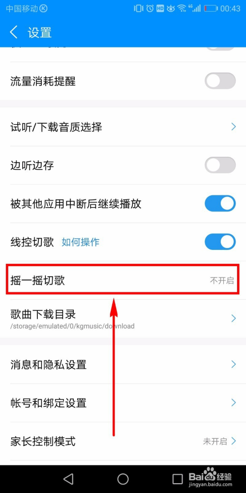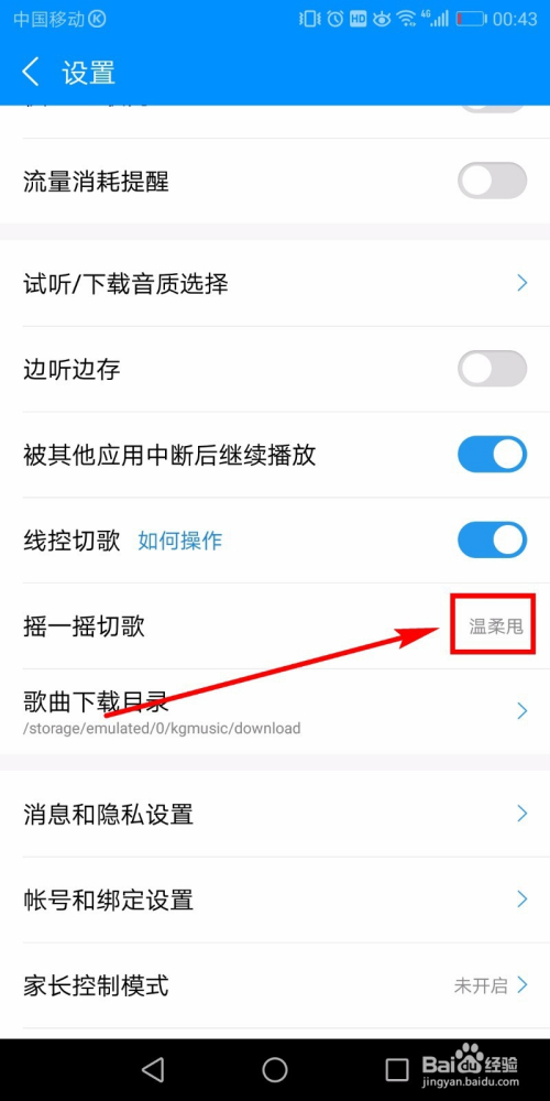 选择好之后回到设置页面,可以看到摇一摇切歌后面的状况酿成了某某甩,这申明设置当作功了。