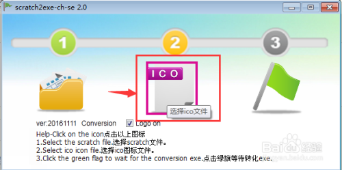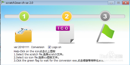 要想将scratch文件酿成可执行文件,需要借助一个特别的东西软件,它叫scratch2exe-ch-se,在网上下载好它,打开这个软件,进入其界面;