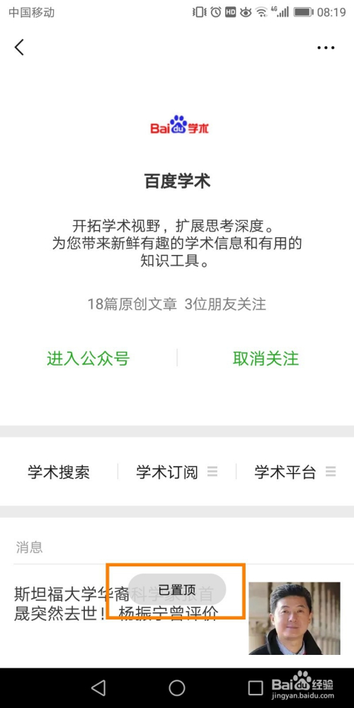 点击置顶公家号后,页面上显示【已置顶】时,置顶当作功。
