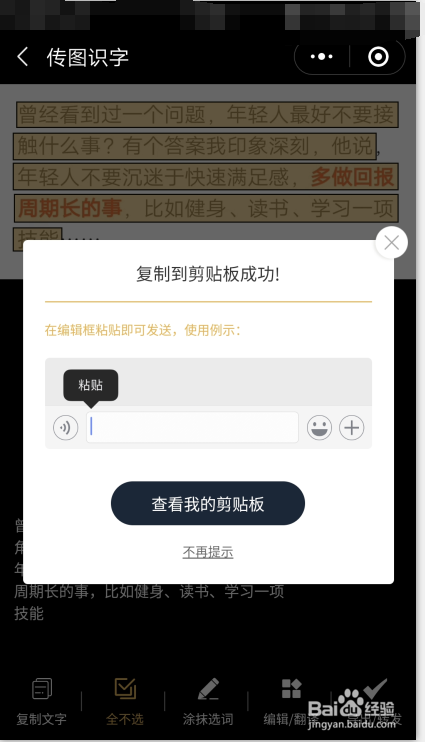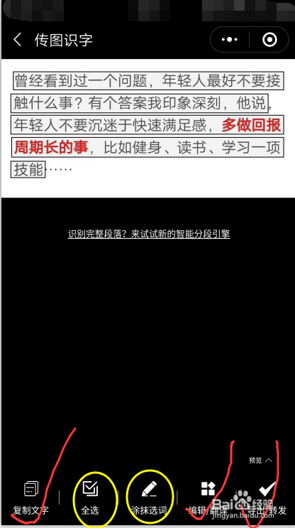 图片拍摄或上传之后,法式会主动识别文字(方框内便是识此外文字),涂抹要提取的文字内容或全选;