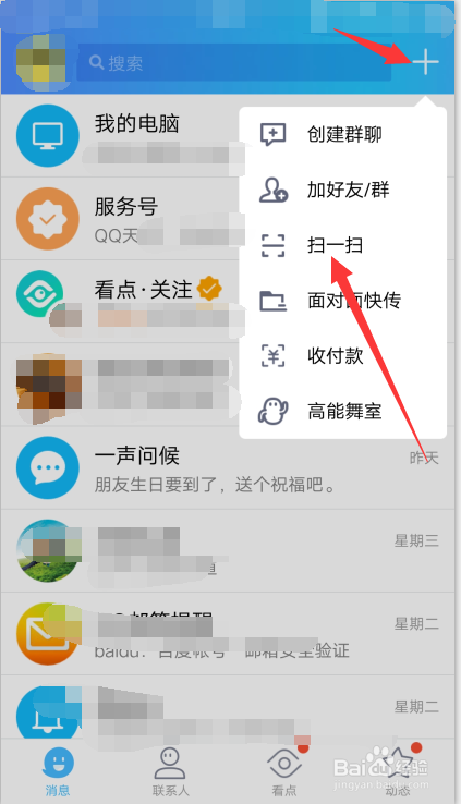登录QQ,点击右上角+,扫一扫;