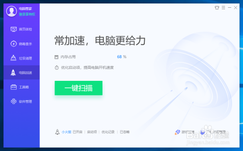 然后打开电脑管家后,选择本家儿界面上面的电脑加快按钮,选择一键扫描会主动检测后台历程