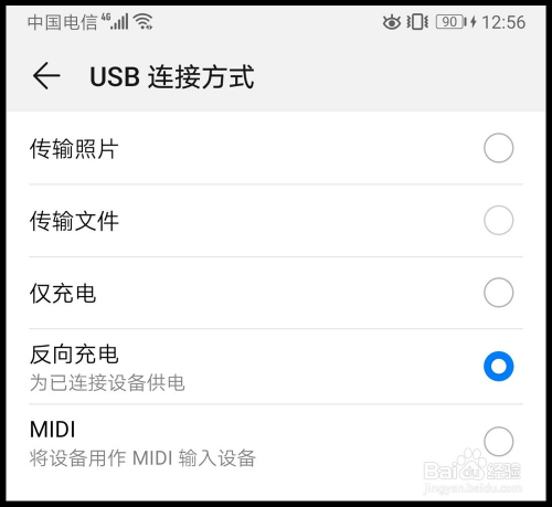 第五步,选择“反标的目的充电”选项后面的单选框,如许华为mate20手机就起头为直连的设备起头进行充电了。