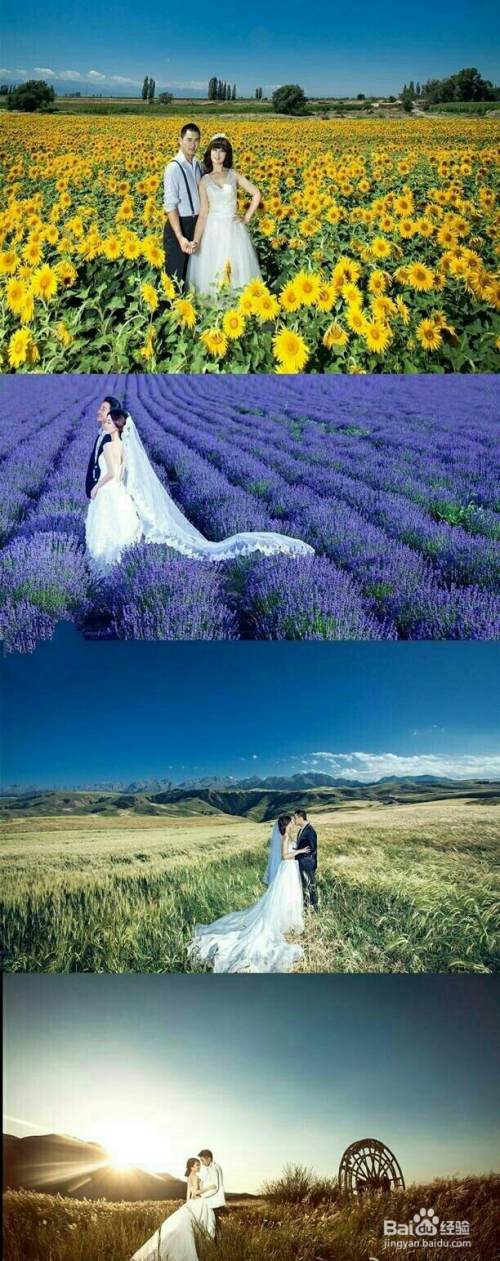 新疆的代表性建筑和本地的代表性风光更是拍婚纱照的好素材,一望无际的薰衣草和标的目的日葵都是拍摄婚纱照的好风光。如下图照片可供参考。
