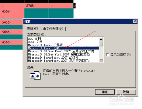 再打开的对象窗口中,选择“MICROSOFT EXCEL图表”,点击确定,如下图