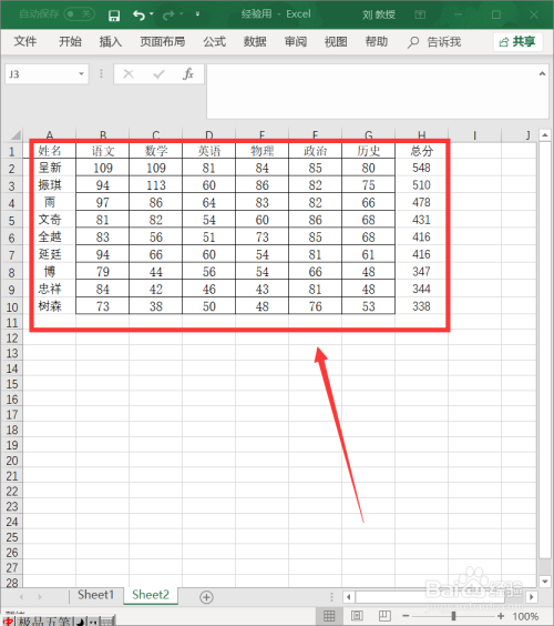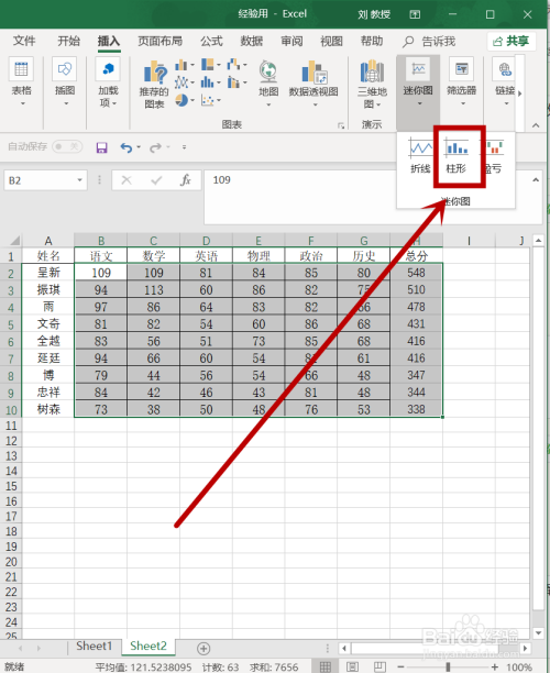 选中要进行图表处置的数据规模,这里选择B2-H10单位格后,找到菜单栏中的“插入”单击