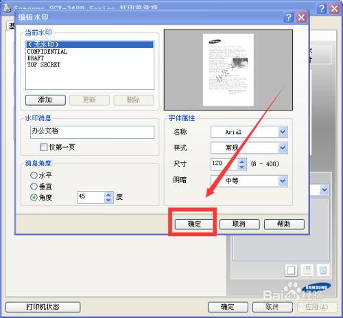 在该页面还可以进行“角度”、字体属性等其他设置,我们可以随时查看预览页面。完当作设置后单击“确定”