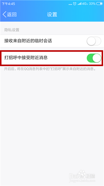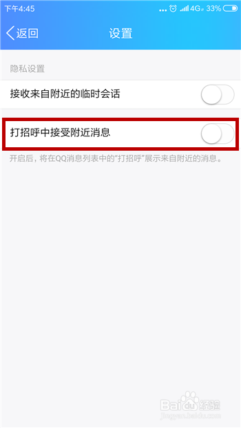 点击后即可封闭打号召接收动静功能,如许大师就接收不到四周的人打号召动静了。