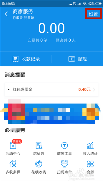 接下来在商家办事中的右上角就是【设置】功能,点击打开设置界面。