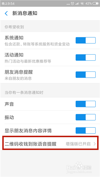如许就当作功开通了收钱提醒的语音提醒,返回到之前的界面可以看到已经开启。
