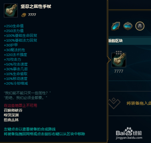 我们可以此刻配装功能中查看一下这件装备的属性,售价位为7777金币,包含生命值、法力值、进犯力、神通强度、进犯速度、暴击几率、护甲、魔法抗性、冷却缩减、移动速度等很周全的属性
