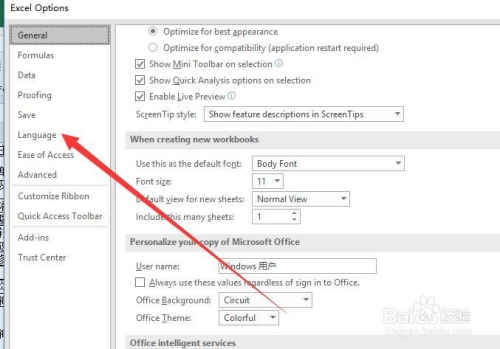 option,也就是选项界面,可以做一些ofiice相关设置。在option里面找到如图所示的languages,也就是说话设置。
