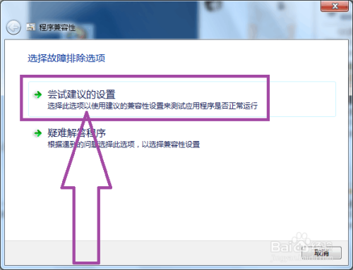 然后点击“兼容性疑难解答”,弹出法式兼容性的窗口,在窗口中我们可以看到“测验考试建议的设置”,