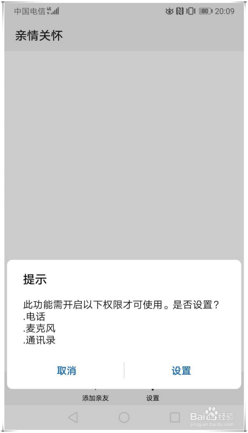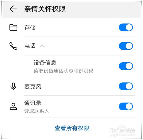 打开亲情关切,会提醒需要德律风、麦克风、通信录等权限,点击设置,将相关权限开关打开。
