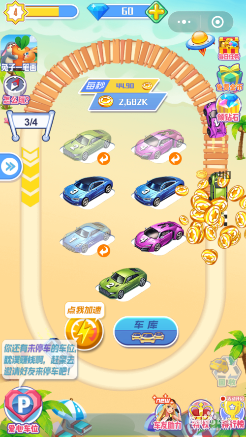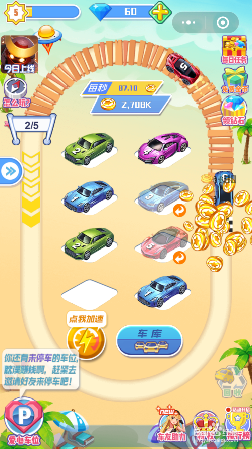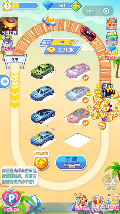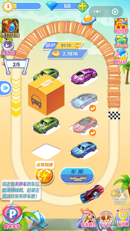 然后将新条目车立即放在跑道长进行行驶得分,要点加快行驶,获更多的积分,再用得分采办更多的车来抢占车位,再合进行当作高级车,如许一向轮回积分-进级-买车-抢占车位-合当作新条目车-放入跑道行驶积分-----。