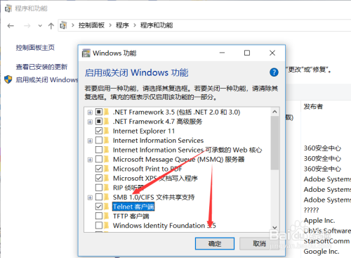 将对护理的【Telnet客户端】勾选中,然后点击下面的【确认】,如下图所示。