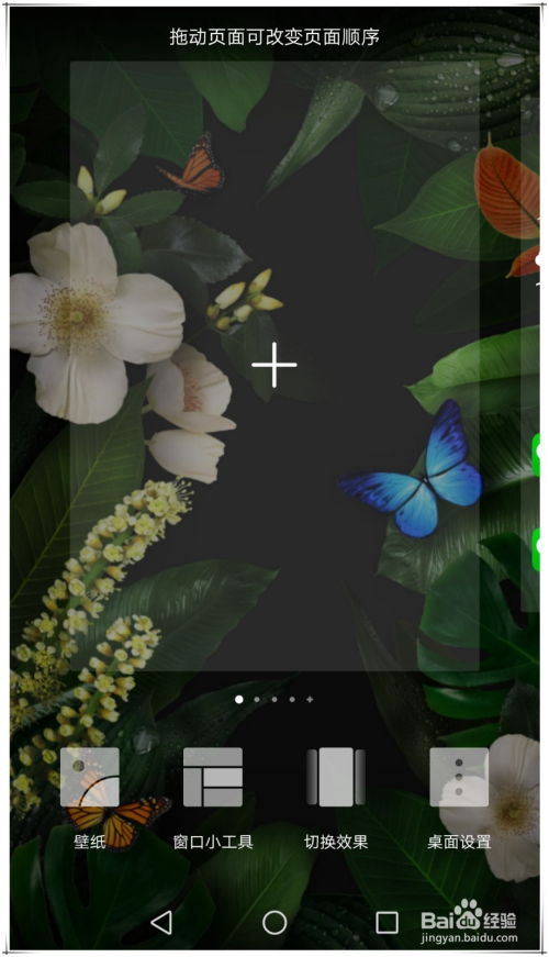 第一步,打开手机,解锁,回到桌面,然后进入桌面设置模式(用两支分隔手指按住屏幕,挨近滑动,松开)。