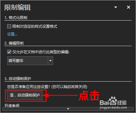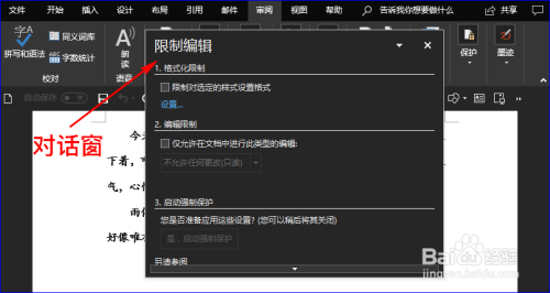 接着在“核阅”子项中点击“庇护”选项,并在扩展框中选择“限制编纂”选项,这时会弹窗对话窗。如图所示: