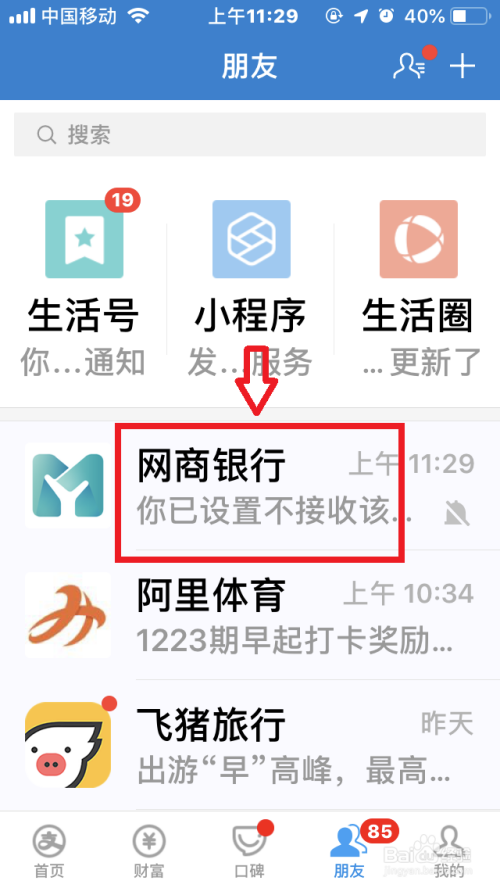手指标的目的左滑动选中的老友或商户,点击“免打搅”,即可设置“动静免打搅”。