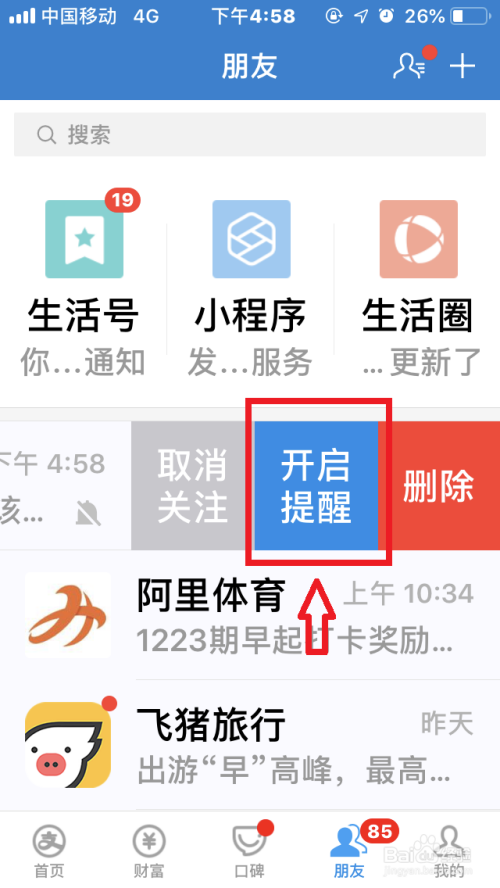 手指标的目的左滑动选中的老友或商户,点击“开启提醒”,即可开启“动静提醒”。