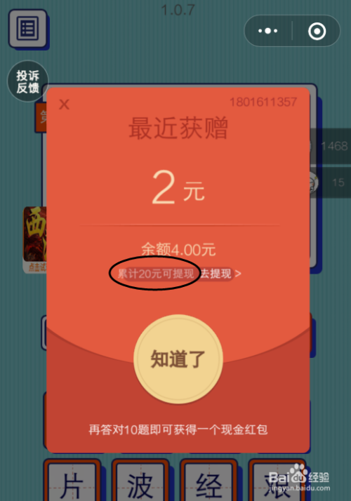 持续答对10个标题问题,就会获得可以提现的【红包】。