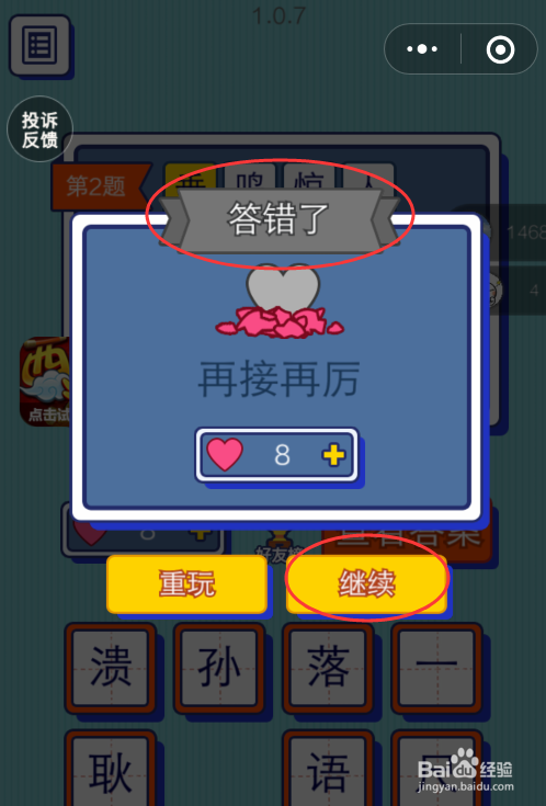 答错了,可以选择“重玩”,或者“继续”。