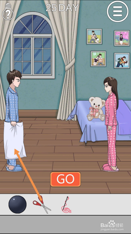 获得铰剪后,点击熊头上的针线,然后将铰剪拖动到枕头上。