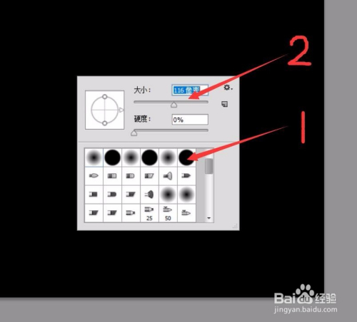 在画布上肆意位置,点击右键,在弹出的画笔设置窗口上,选择画笔的类型,再设置画笔的笔头大小。