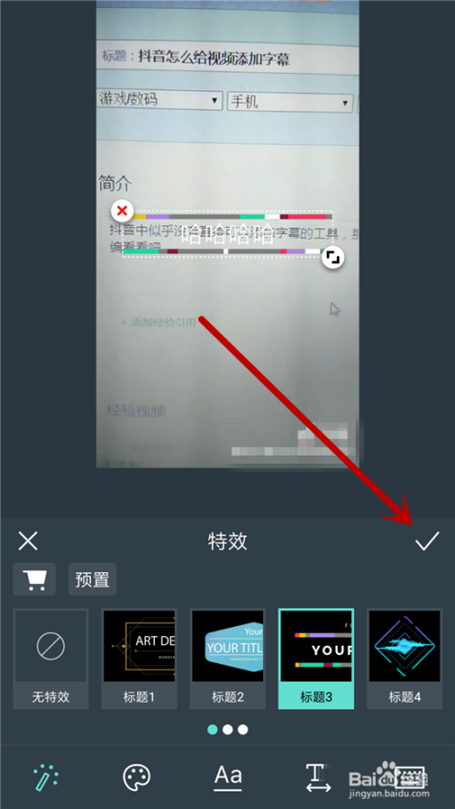 如许返回到之前的界面就可以看到文字添加的结果了,点击【√】即可添加文字到视频中。
