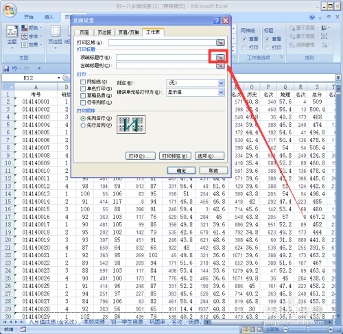 在“页面设置”页面选中“工作表”选项卡。单击“顶端题目行”后面的选择区域按钮