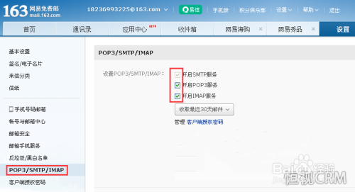 若是是新申请的163邮箱,要开启SMTP及POP3办事需要开启客户端授权密码,如下图所示,点击【客户端授权密码】【开启】。开启后设置恒视CRM软件邮箱账号的SMTP和POP3账号密码时要输入方才设置的客户端授权密码,而不是邮箱登岸密码。