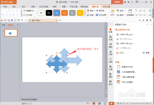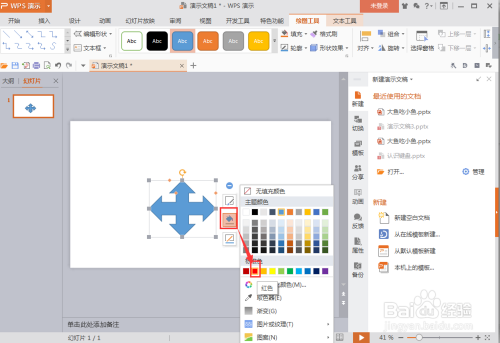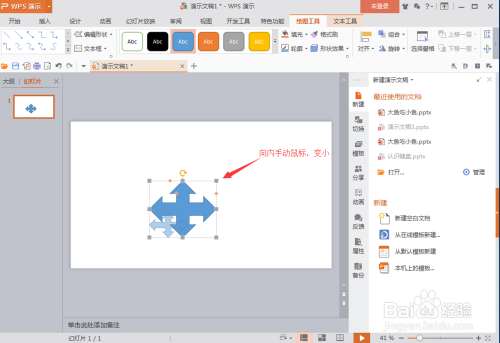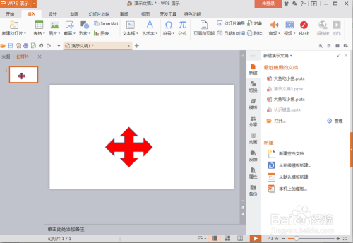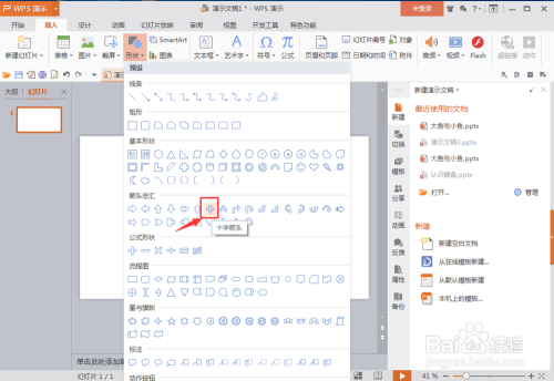 在wps中按照现实需要,可以插入很是丰硕的外形,今天介绍一下如何在wps中插入十字箭头,并对其进行大小和颜色的改变。