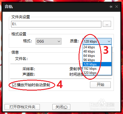 在呈现的对话框内,第一步:选择好你要保留音频文件的位置;第二步,选择你要保留的音频文件格局,这里可以按照本身的爱好来选择;第三步,选择你要保留的音频的采样率,采样率越高音频文件质量越好!第四步,勾选“播铺开始时主动录制”(这里请记住在录制完毕后打消这个勾选,不然今后你只要开视频它就会主动给你采集音频了,切记哦,音频采集完毕后去失落这个勾选!)