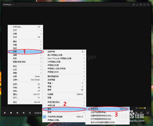 在播放器本家儿界面上单击鼠标右键,选择“声音”选项,子菜单选择“音轨”,再继续选择“声音录制”