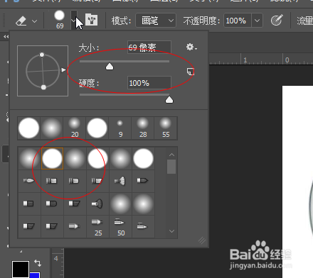 - 6然后在辅助栏中选中橡皮擦画笔大小和样式,将混乱部门擦除