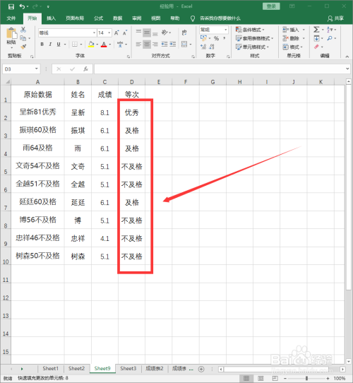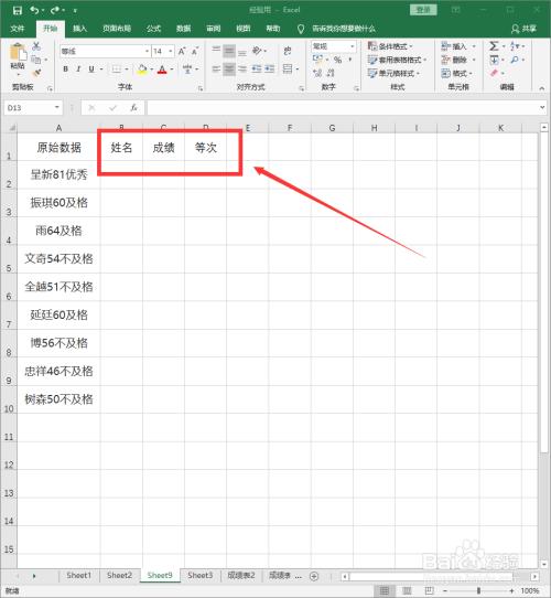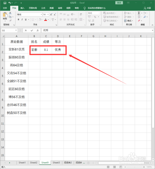 在B2-D2单位格别离输入A2单位格中包含的信息“呈新”“81”“优异”
