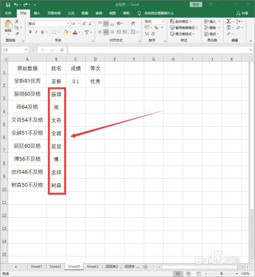 打开一个电子表格文档。第一列有组稠浊在一路的数据,要求按“姓名”“分数”“等次”分拆当作三列