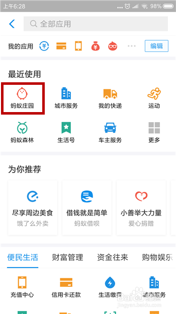 然后在应用的比来利用里面找到【蚂蚁庄园】并点击打开。