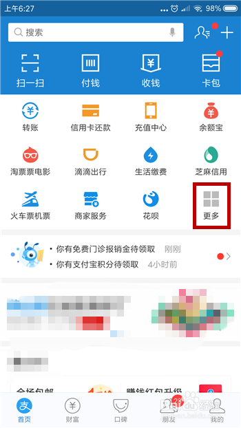 接下来打开付出宝后找到顶部的【更多】选项并点击打开所有应用界面。