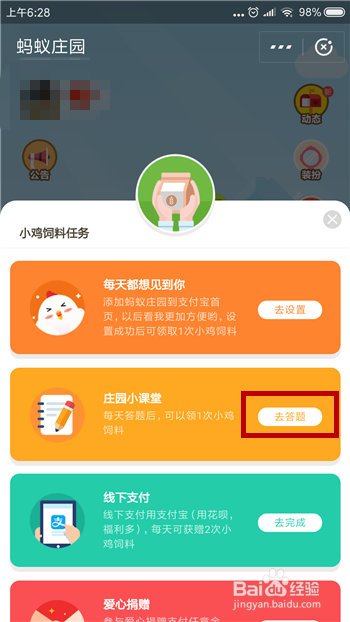 接下来在领饲料使命中找到庄园小讲堂使命,点击里面的【去答题】。