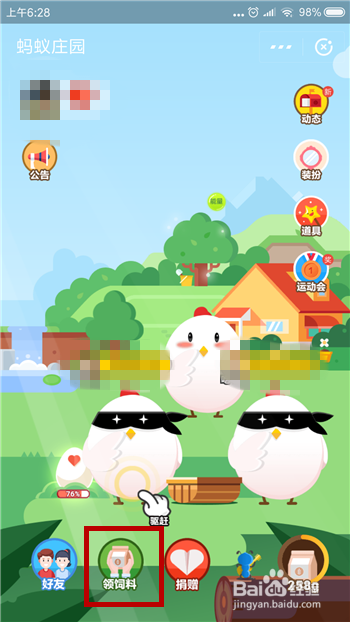 在蚂蚁庄园里面下拉界面,找到【领饲料】并点击。