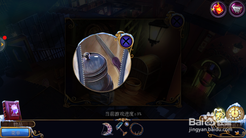 之后,我们回到广场,点击人偶左侧窗户的位置,如下图所示,操纵撮甲刀拿到钥匙,操纵月亮挂饰拿到下方的另一个门环。之后回到餐厅,点击锁的位置。操纵钥匙开锁。之后调整铁链位置,如下图所示。